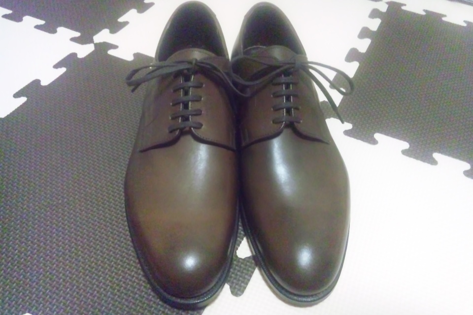 ダークブラウンの外羽根プレーントゥです。コバの張り出しは控えめで上品な感じです。